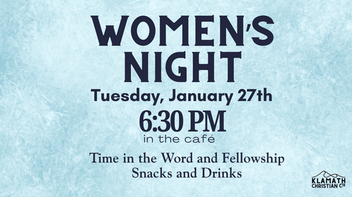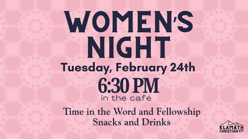Women's Bible Study: James - Steadfast, led by Rachael Poetzl. Thursdays 4:30-5:30PM. Starting Feb. 5 and meeting for 7 weeks. In Room 201. Register online or email rachaelp@klamathchristiancenter.org to sign up. Cost is $10 for the book.